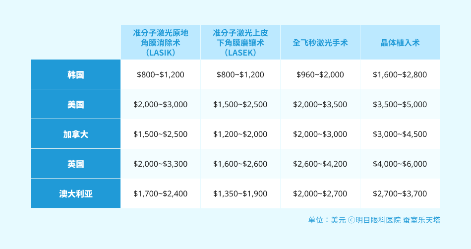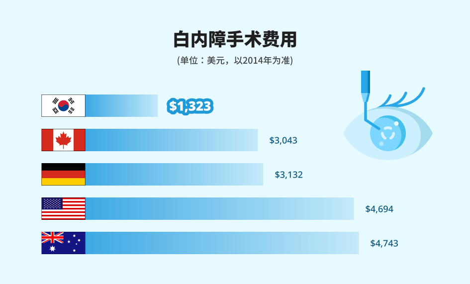 韩国医疗体系以费用实惠、治疗迅速闻名。韩国的白内障手术费约为1329美元,在经合组织主要成员国中最低。在美国,白内障手术需支付4694美元,是韩国的约3.5倍;加拿大需支付3043美元,是韩国的约2倍。1)韩国眼科的另一个优势是从诊疗、检查到手术的全过程都十分迅速。尤其是视力矫正和白内障能做到日间手术,这是因为每家医院都拥有手术室和尖端专业设备,诊疗后能立刻进行手术。