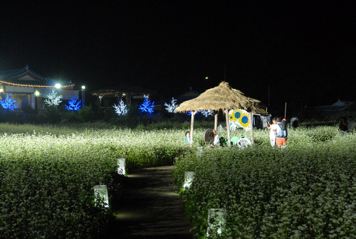 韩国小说家李孝石出生于江原道平昌,他为后世留下了众多融合优美自然风光与故事的优秀作品。《荞麦花开时》是他的代表作品,被收录在教科书中,平昌蓬坪就是这部作品的背景地,为了纪念李孝石并宣传蓬坪之美,蓬坪每年秋天都会举办庆典。期间将举行写作大赛、诗画节、制作专属图书等丰富的文学相关活动,到了晚上还将上演结合文学与音乐的小型演出,为庆典增添一份浪漫。在庆典举办之际,村庄周边的田野会遍覆白色荞麦花,犹如遍地银雪般壮观。以荞麦田为背景,在平昌孝石文化节推荐的拍照区拍张漂亮的照片吧!