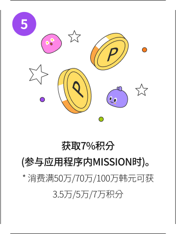 - MISSION 7%积分分段为50万韩元/70万韩元/100万韩元至1亿韩元,可按分段积累积分,且以7%的固定比率支 付。