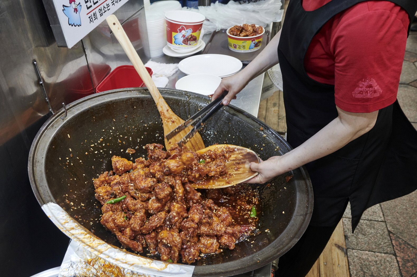 新浦国际市场最有名的小吃非甜辣鸡块莫属。酥脆的鸡块裹上青阳辣椒等配料调制而成的香辣酱,与其他地方不同的是,这里的鸡块通常会含有骨头。 甜辣鸡块比看起来的还要辣一些,如果不太能吃辣,可以买几个空心饼就着一起吃。