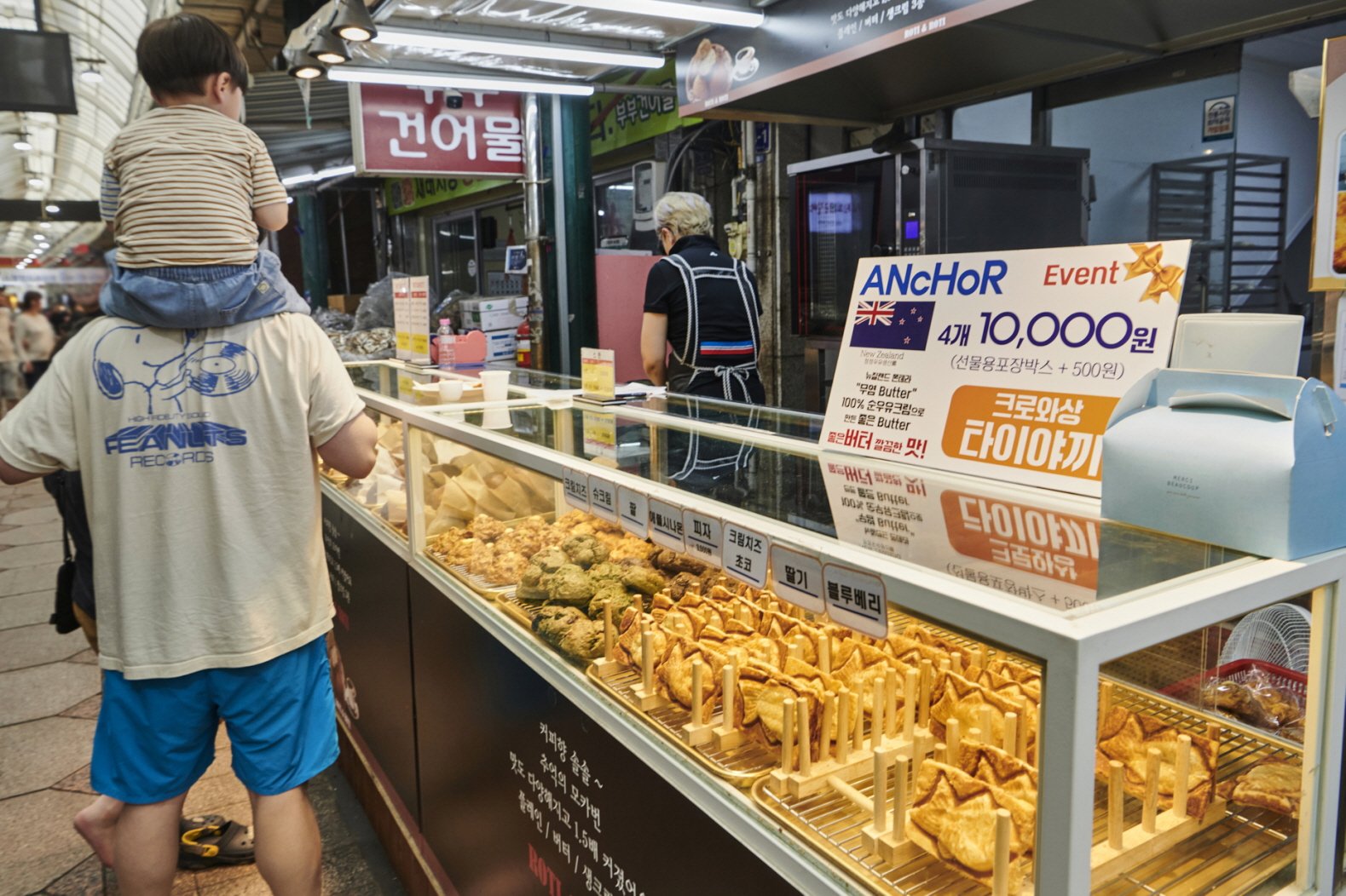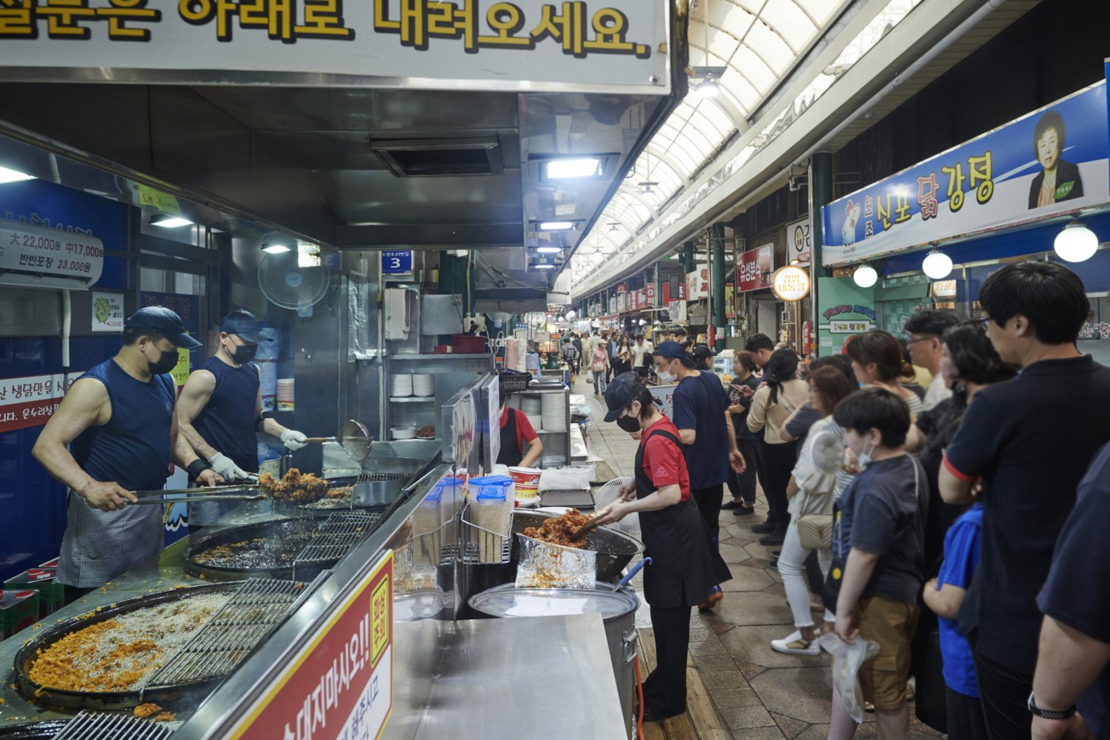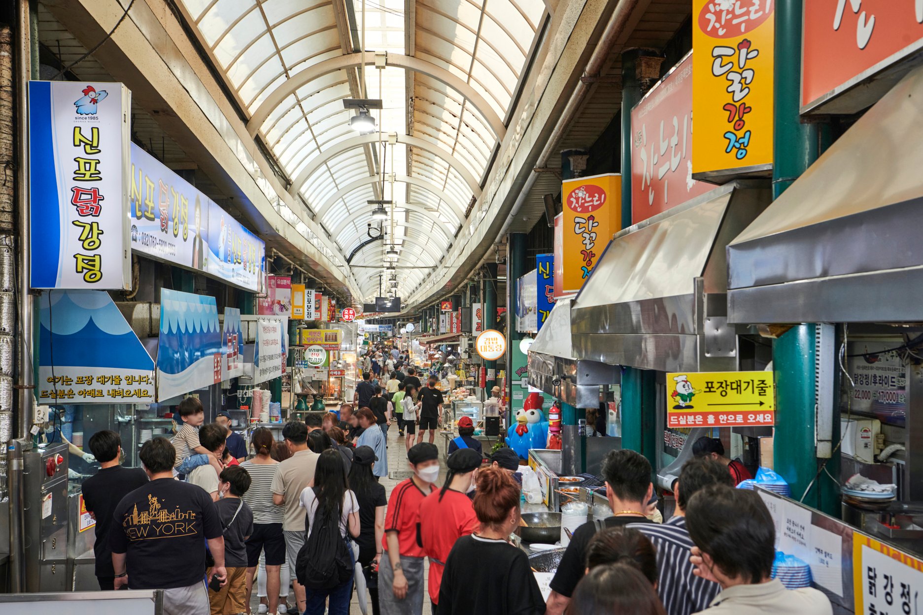 市场内,按照蔬菜、水果、水产、小菜等种类对场地进行了分门别类的划分,即使是第一次前来的人也能轻松找到自己想买的东西。作为一家历经悠久岁月的老牌市场,这里的美味小吃应有尽有。辣炸鸡块、饺子、刀切面、拌筋面、空心饼、血肠、炸什锦、香煎鮸鱼片……说到新浦国际市场非吃不可的小吃,十个手指根本不够用,所以必须空腹前来。市场的2层有一条“回忆中的新浦古道”。这里贴满了市场初创时期的照片与图画,沿着狭窄的走廊一路看下来,会被虽然不富裕却充满了人情的市场历史深深暖到。如果您想走遍市场中的每一条小巷,不妨前去新浦国际市场支援中心去索取地图,按图索骥,细细逛起。