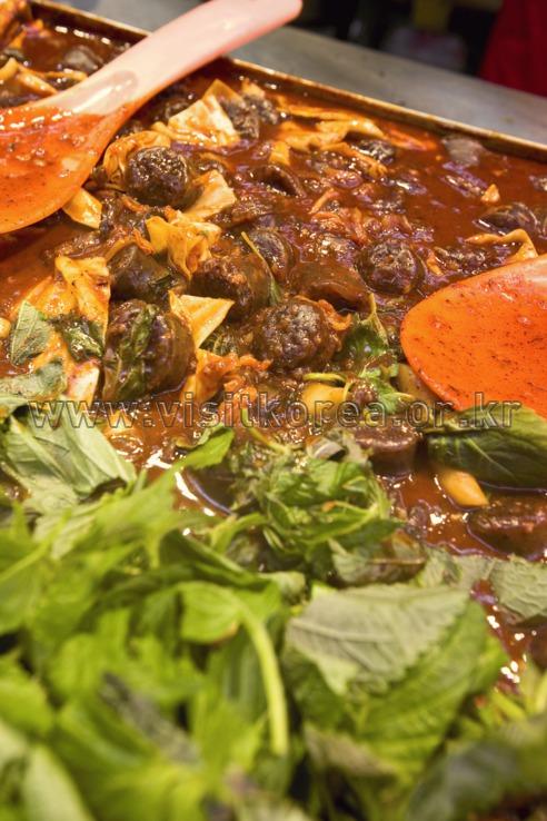 池洞市场的血肠美食城与首尔新林洞和安养中央市场并列为全国三大血肠美食街。血肠炒小肠由软糯Q弹的糯米血肠和筋道的小肠组成,再配上新鲜的蔬菜,蘸上鲜脆的生辣椒调成的元祖辣椒包饭酱更是锦上添花。菜品分量很足,点餐的时候可以保守一点。