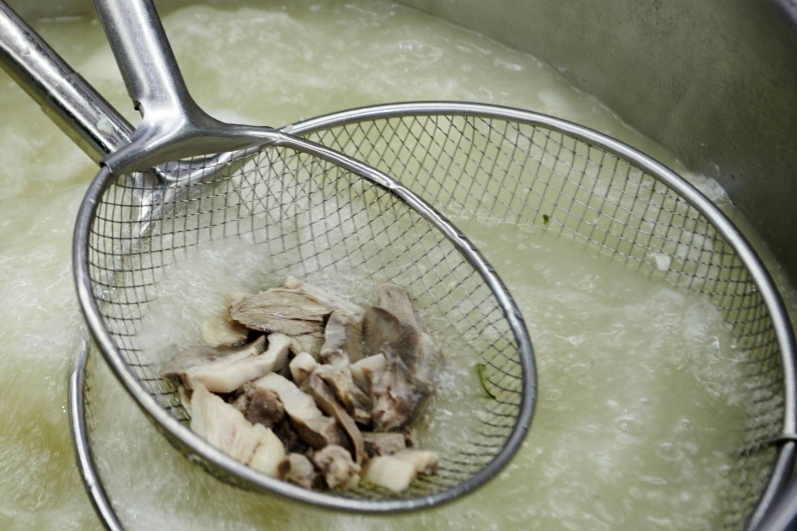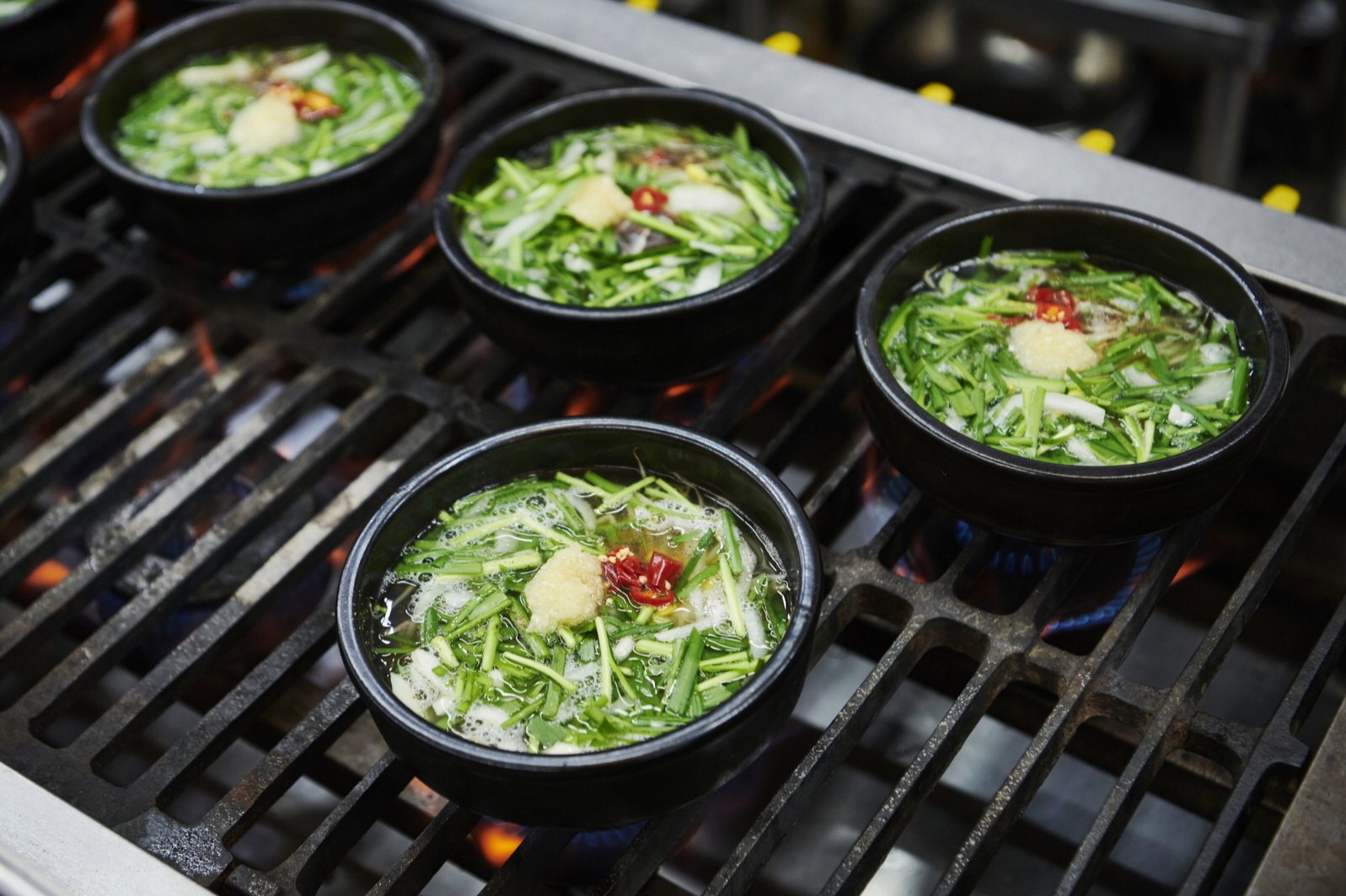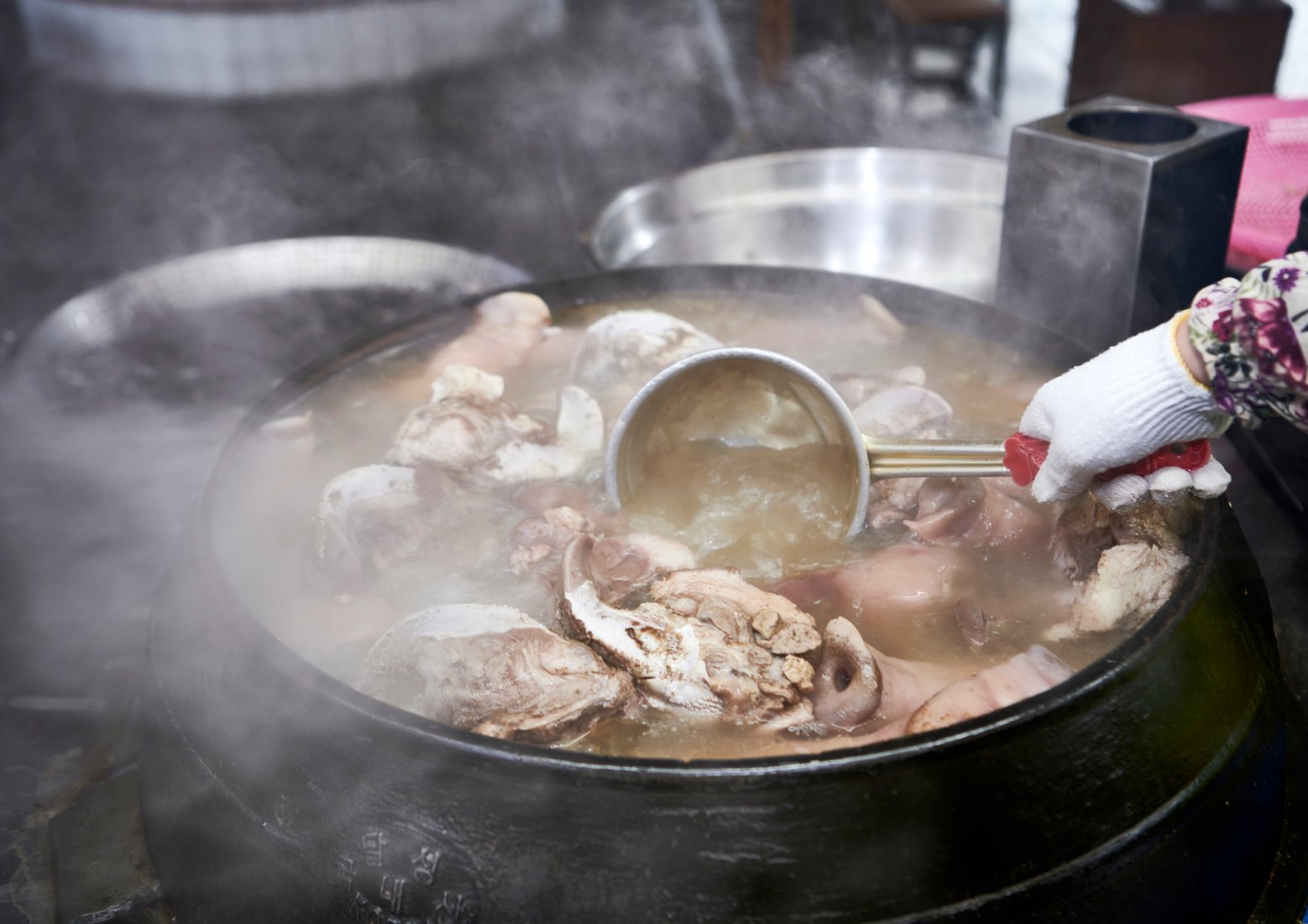 此地猪肉汤饭的高汤不是用猪下水,而是使用猪头肉来熬煮,因此特别利落爽口。再加上分量十足的黄豆芽,使汤底不带一丝油腻,清爽口味令当地人与游客全都为之倾倒。如果点两碗汤饭,会先上一盘配上韭菜和血肠的刀切肉,而且还是免费赠送。