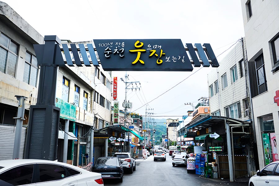 肥沃的土地、宽广的海洋、丰饶的滩涂、幽深的山谷……顺天拥有得天独厚的自然环境。那些要前往求礼、筏桥、光阳等地的集市分别采买的各地特产在被誉为“百年上集”的顺天上集都能买到。每天开放的常设市场已经足够琳琅满目,要是赶上每逢尾数为5、0的日子召开的五日集,全罗南道各地食物、谷物与蔬菜以及刚刚捕捞上岸的生猛海鲜更是集聚一堂。就像市场入口的牌楼上写的,这里满是“笑口常开赶大集”的人们。
