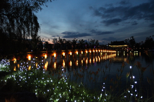 因薯童谣而广为人知的扶余宫南池,是在百济武王35年(西元634年)打造而成,为韩国现存最古老的人工莲花池。每年7月在扶余薯童莲花节期间,可在此一次欣赏到白莲、红莲、水莲等10万多坪、50多种莲花。莲花池中央名为抱龙亭的凉亭,以及在莲花园区各处内设置的换就小型瓜棚,不仅适合情侣约会,也是备受小朋友欢迎、观察野生花与水生植物的自然生态学习场地。微微韩国夏季的代表庆典,扶余薯童莲花节被文化体院部选为文化观光庆典的“潜力庆典”,得天独厚的自然环境 与宫南池秀丽美景,吸引着无数游客前来造访。
