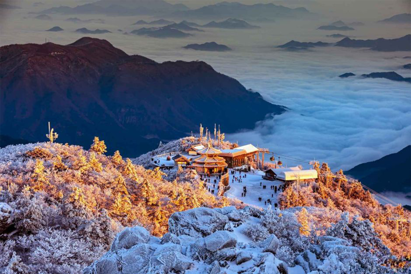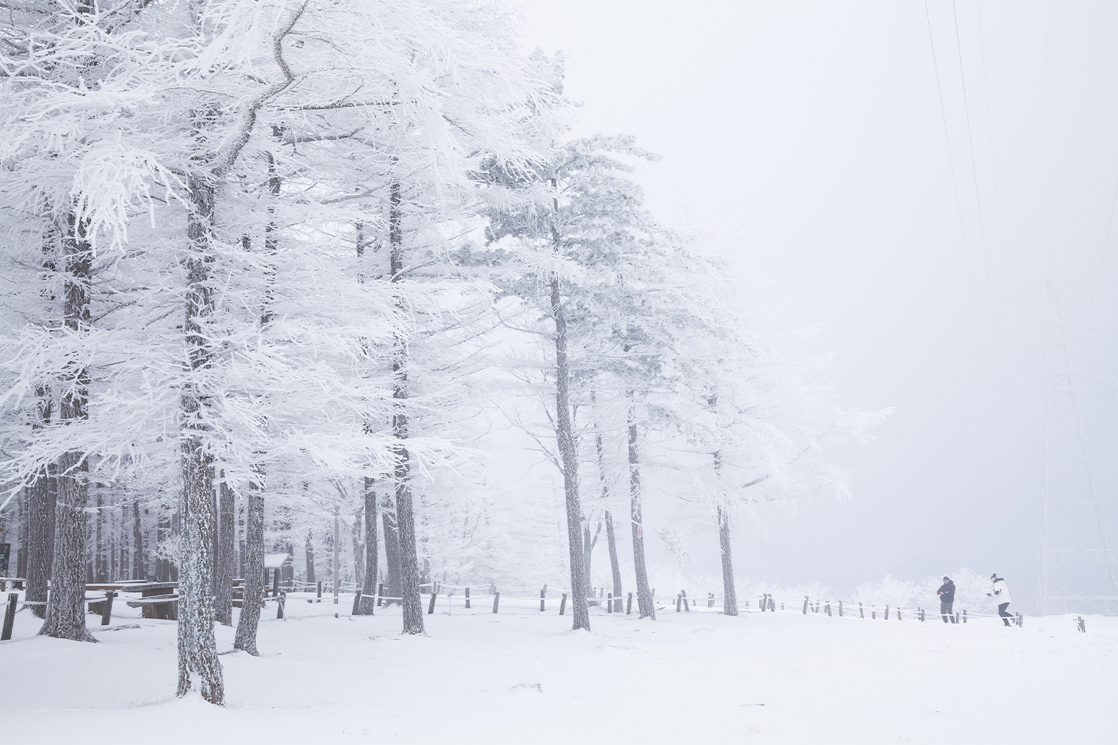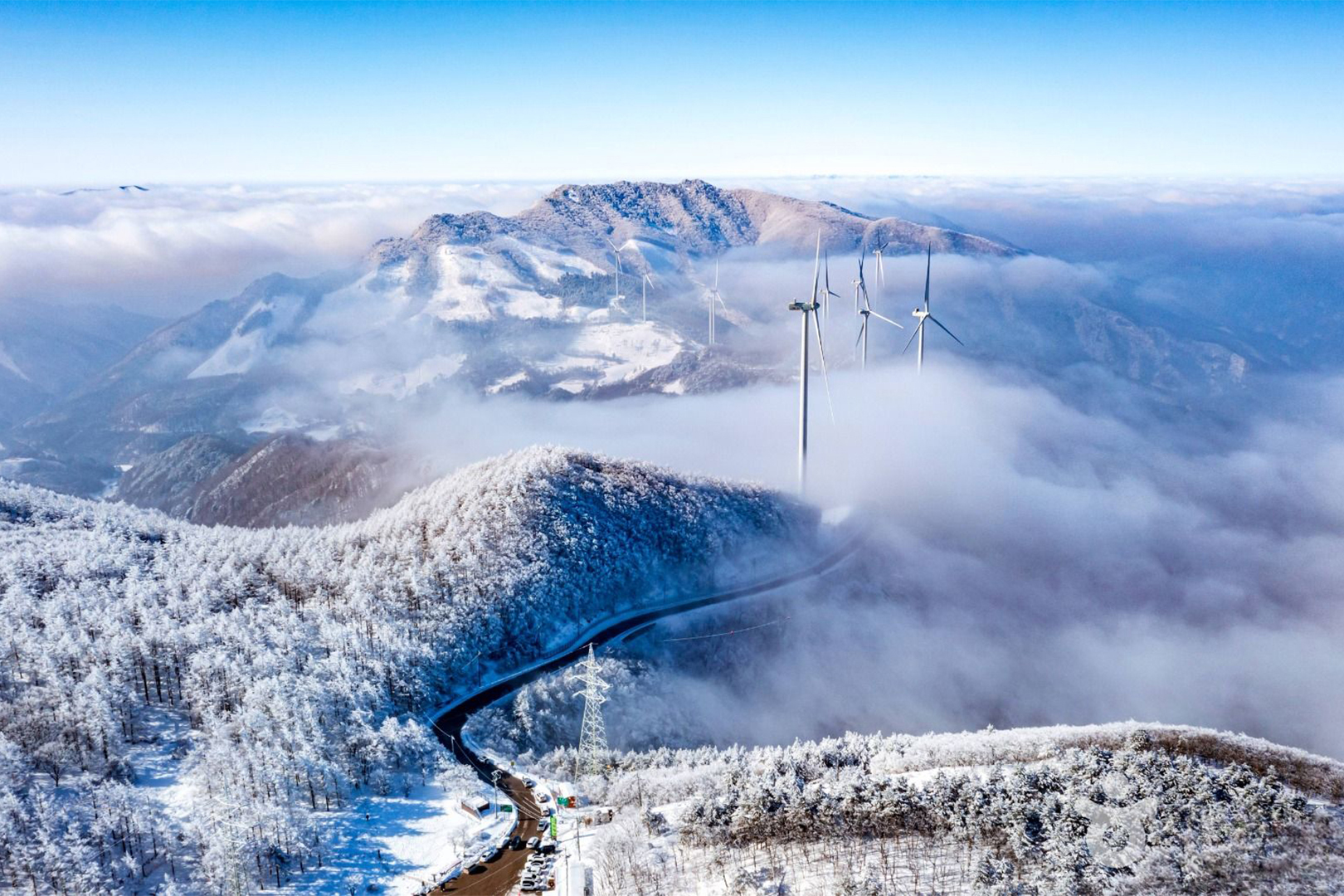 The Manhangjae Pass on Hambaeksan Mountain, which served as the backdrop for the final-episode chase scene in Queen of Tears, is famous for its winter-wonderland scenery, where snow flowers cling thickly to every branch. The clouds that descend to the ground early in the morning sometimes overlap with the fog to create a unique scenery. Deogyusan Mountain in Muju, featured in the variety show