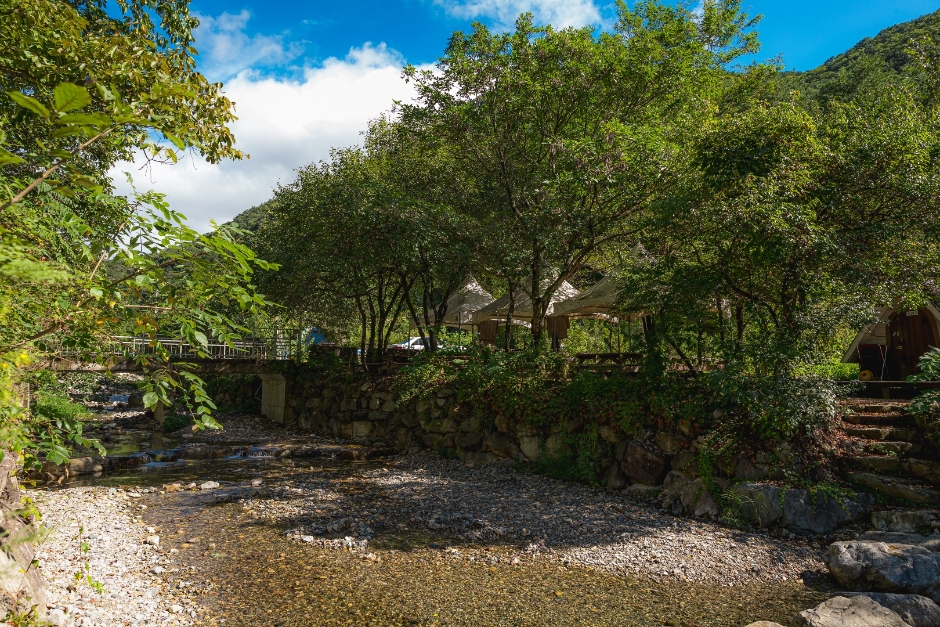 Damteo Oji Camping Ground is located in the tranquil Damteogyegok Valley, famous for its crystal-clear waters, offering the perfect environment to enjoy nature ASMR. True to its name (Oji refers to a remote area), it’s situated in a secluded mountain area. However, its eco-friendly layout and various amenities have made it a popular destination, often leading to competitive reservations on nice days. In the variety show “I Live Alone,” Hwasa of the group MAMAMOO visited the site with her fellow dancers, where they enjoyed playing in the water, eating instant noodles and grilled pork belly.
